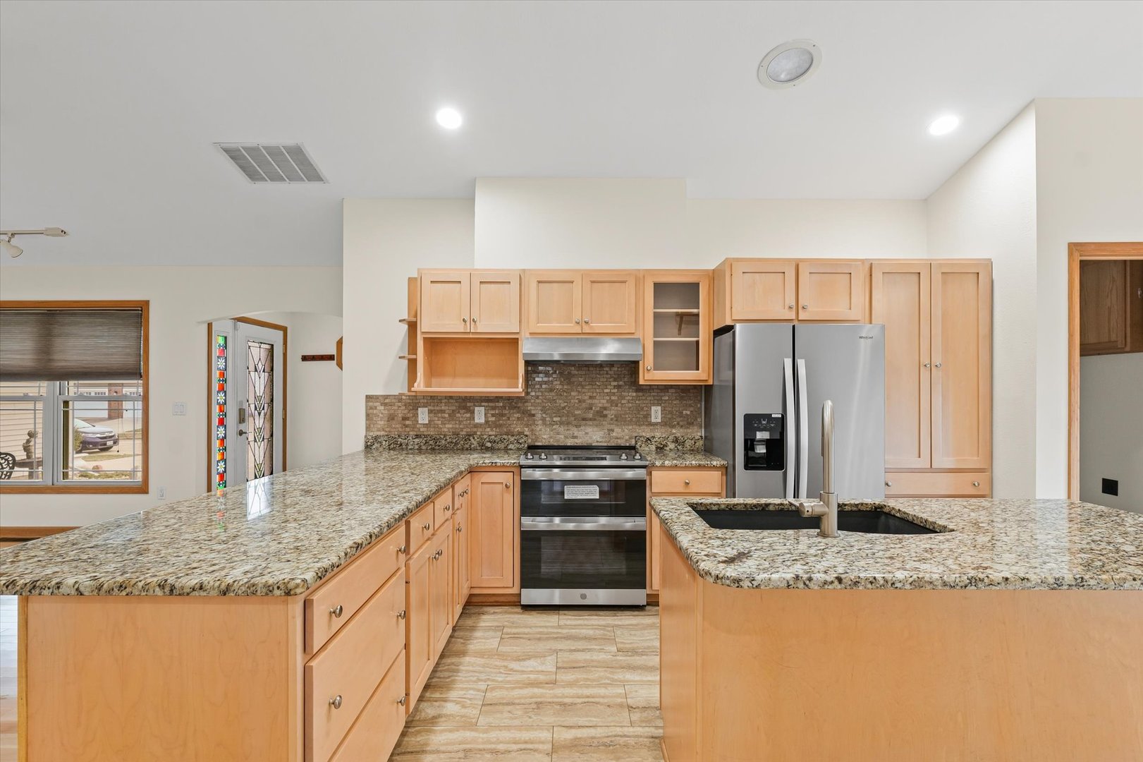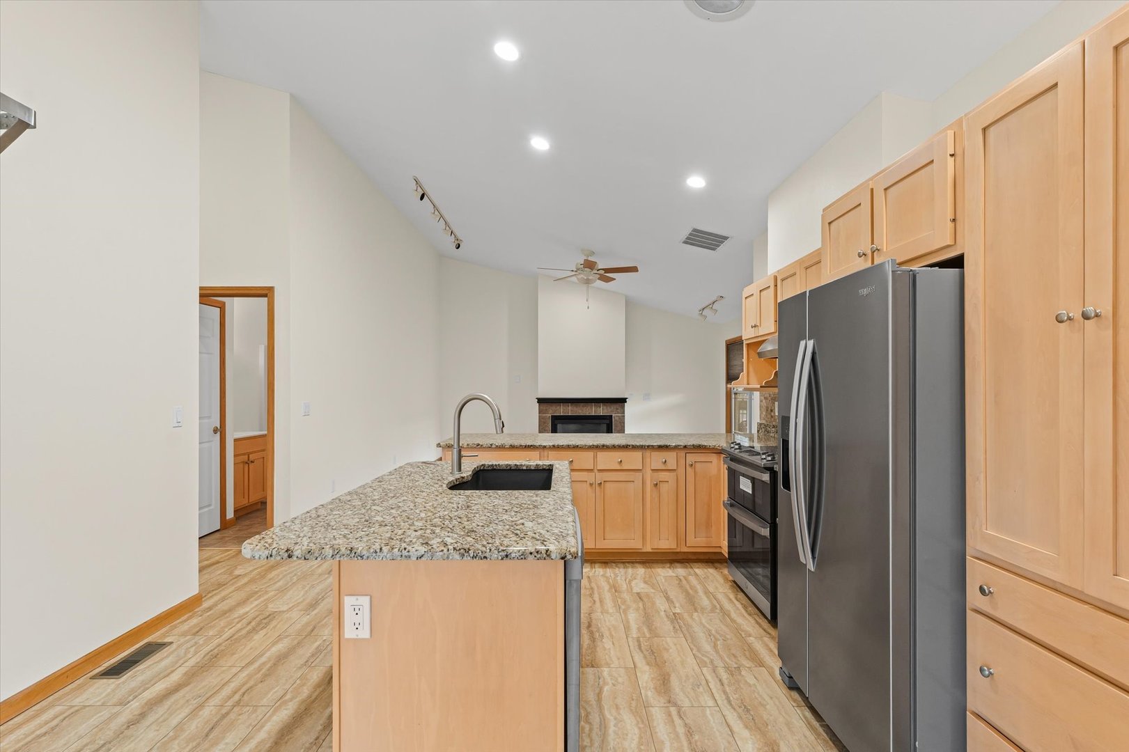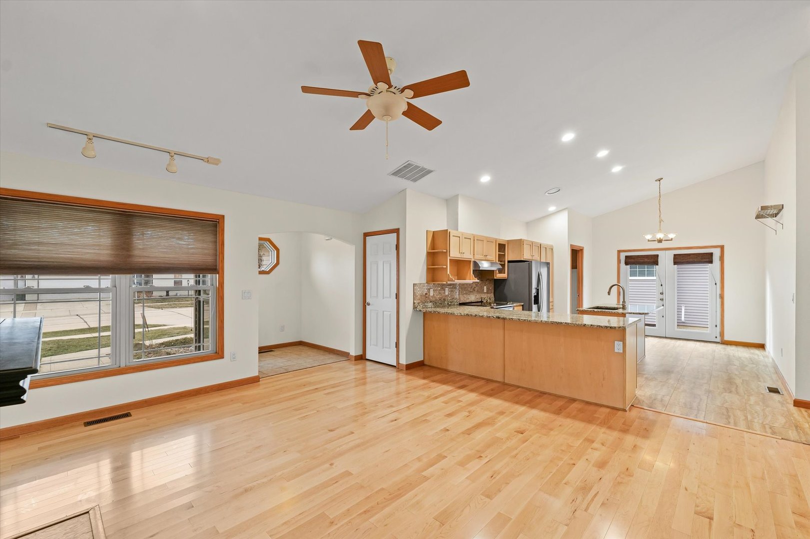 Looking to downsize, looking to move or just starting out, this well maintained home is ready for you. Entry way greets you to large vaulted ceiling living room with fireplace. Home has recently been updated with new flooring, fresh paint, new countertops and stainless steel appliances. Plenty of Amish built cabinets and breakfast bar. Never need enough storage?..you will love the large pantry off of the kitchen. Top of the line 2 stage heating and cooling system to keep your utility bills well managed. Nice concrete patio with bench ,right out the doors from the kitchen which makes a great area for grilling and just hanging out.. Master bedroom suite offers large walk-in closed, beautifully tiled tub surround and dual sink vanity. 2 more bedrooms and full bath complete the package. Roof is 5 years old. French doors off kitchen were new in 2024. |