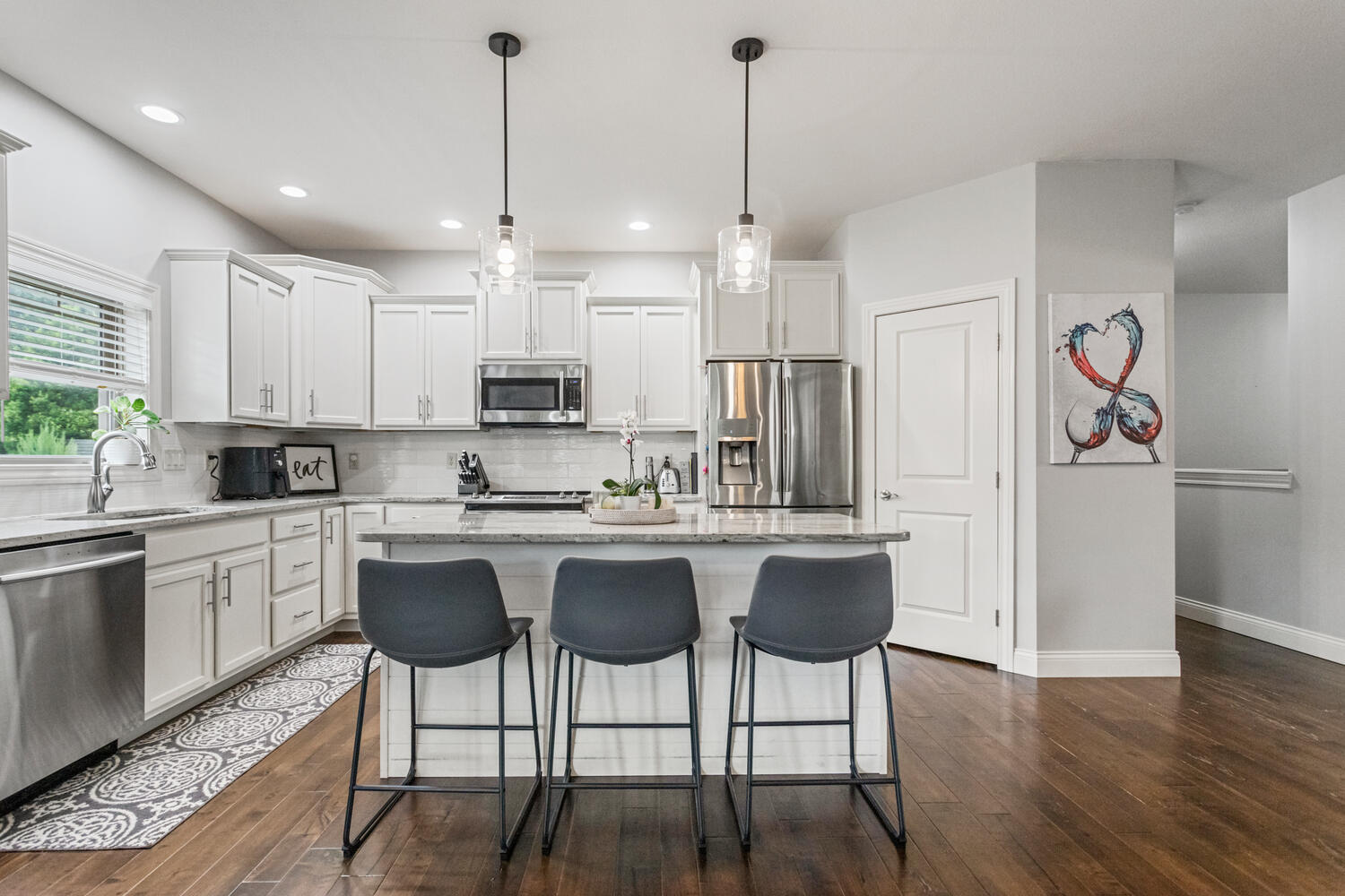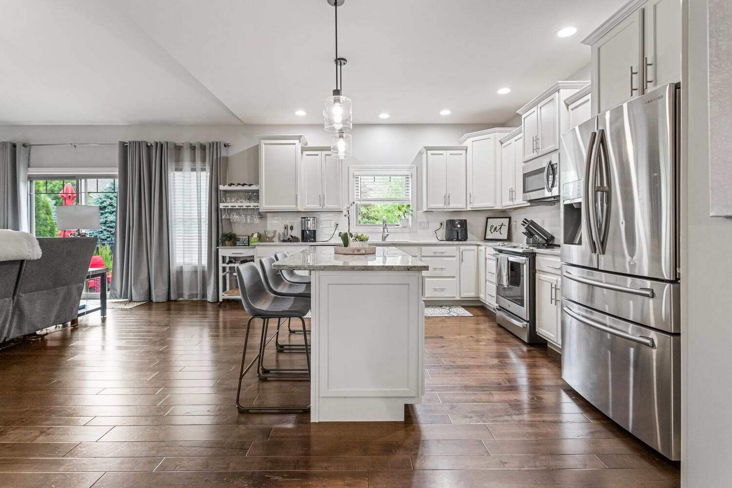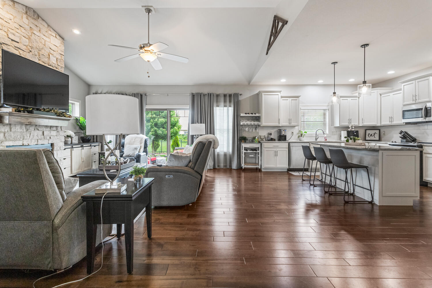 This beautifully maintained, better-than-new ranch home offers the ideal blend of thoughtful design, finished amenities, and an unbeatable location close to top-rated schools, shopping, and dining-everything today's busy households value most. With 4 bedrooms, 4 full baths, a partially finished basement, and a 3-car garage, the open-concept layout is both functional and inviting. The cathedral-ceiling great room centers around a cozy gas-log fireplace and flows seamlessly into a dedicated dining area-perfect for everyday living and entertaining alike. The kitchen is a true gathering space, featuring a large granite and shiplap island, stainless steel appliances, abundant prep space, and hardwood floors throughout the main level. Three bedrooms are located on the main floor, including a spacious primary suite with a spa-like bath offering a soaker tub, walk-in shower, private toilet area, and generous walk-in closet. Practical details elevate daily life, including a separate laundry room with folding space and a welcoming mud/drop zone off the garage complete with bench and coat hooks. A main-floor mother-in-law suite adds flexibility, offering its own private bath and French doors that open to a peaceful private patio. The finished basement expands your living space with a large fourth bedroom, full bath, movie room, built-in desk area, and an impressive 1,238 sq ft of unfinished storage-complete with multiple storage racks, something rarely found in new construction. Step outside to enjoy the professionally landscaped, fully fenced backyard-a standout upgrade you won't get with a new build. Mature plantings, concrete BorderMagic edging, window treatments already in place, and a rear patio off the great room create a move-in-ready outdoor retreat perfect for entertaining or unwinding. This home offers the ease of a newer build without the added expense, time, or hassle-all in a location that keeps you connected to schools, dining, and everyday conveniences. |